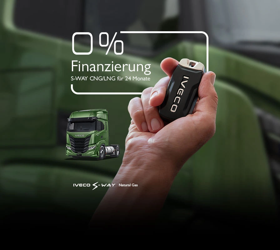 1Freibleibendes Finanzierungsangebot von IVECO CAPITAL* für ausgewählte S-Way CNG/LNG Sattelzugmaschinen, vorbehaltlich einer positiven Bonitätsprüfung. Dieses Angebot gilt für Gewerbekunden in Deutschland und nur bei teilnehmenden Händlern solange der Vorrat reicht. Abbildung unverbindlich. Irrtum, Nachtrag, jederzeitige Änderung und Widerruf vorbehalten.