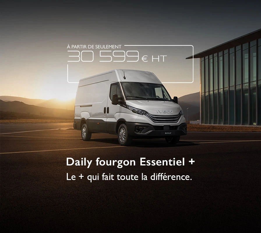 *Offre disponible jusqu’au 31 mars 2026 dans la limite des stocks disponibles. Exemple pour un Daily fourgon Essentiel+ 35S14B V9 avec Pack Confort, portes arrière 270° et siège conducteur suspendu au tarif conseillé de 30 599 € HT. Voir conditions chez votre concessionnaire IVECO participant. Visuel non contractuel.