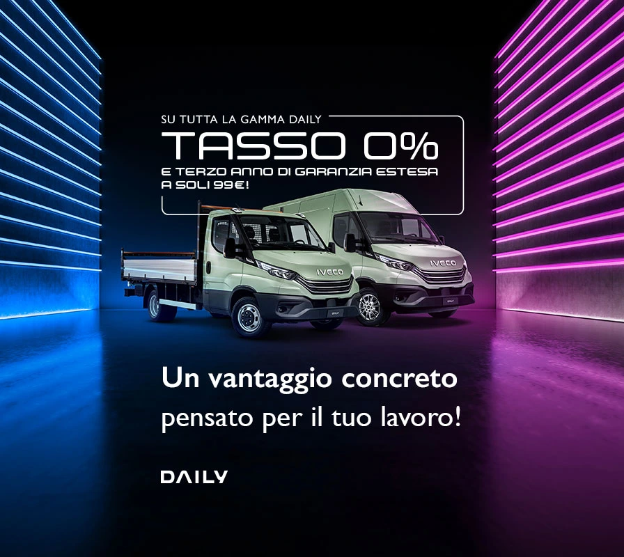 Offerta valida fino al 31/03/2026 presso le concessionarie aderenti e così strutturata: Leasing a 36 mesi a tasso 0% DAILY FURGONE su valori di fornitura fino a 35.000€ e soggetta a condizioni. Esempio di fornitura 28.500€: anticipo versato dal cliente 3.000€, valore finale di riscatto 10%, 36 canoni mensili da 697€ comprensivi di Polizza UP PLUS Furto e Incendio, Tasso Leasing 0%. Spese pratica, IVA, trasporto e messa su strada escluse. Leasing 36 mesi a tasso 0% su DAILY CABINATO su valori di fornitura fino a 45.000€ e soggetta a condizioni. Esempio di fornitura 39.000€: anticipo versato dal cliente 4.000€, valore finale di riscatto 10%, 36 canoni mensili da 957€ comprensivi di Polizza UP PLUS Furto e Incendio, Tasso Leasing 0%. Spese istruttoria pratica, IVA, trasporto e messa su strada escluse. Salvo approvazione IVECO CAPITAL (CNH Industrial Capital Europe S.A.S.). L’offerta prevede l’estensione di garanzia per il terzo anno al costo complessivo di 99€ oltre iva (contratto “XXL”, durata 36 mesi, garanzia valevole per veicoli con percorrenza annua massima di 30.000 km oppure un massimo di 90.000km totali) applicabile solo con attivazione di un leasing a marchio IVECO CAPITAL. Prima di aderire al finanziamento è necessario prendere visione delle Condizioni Contrattuali e dei Fogli informativi disponibili presso le concessionarie aderenti. Possibilità di personalizzare l’offerta con altri importi e durate direttamente in concessionaria. Per i dettagli sui contenuti e sulle condizioni del contratto “XXL” fare riferimento al contratto di estensione di garanzia reperibile presso tutte le concessionarie aderenti. La Polizza UP PLUS Furto e Incendio è un prodotto CAPINSUR della Compagnia Assicurativa Società Reale Mutua di Assicurazioni. Prima della sottoscrizione leggere i SET INFORMATIVI disponibili sul sito: https://www.ivecocapital.com/italy Le coperture assicurative sono prestate da Società Reale Mutua di Assicurazioni per il tramite di CNH Industrial Capital Europe S.A.S., intermediario assicurativo iscritto al R.U.I., sezione UE al n. UE00008195 - PEC: cnh_ce@legalmail.it avvalendosi della collaborazione della rete commerciale iscritta nella specifica sezione del R.U.I e soggetta alla vigilanza dell'IVASS. Gli estremi identificativi e di iscrizione possono essere verificati sul sito internet dell'IVASS (www.ivass.it). Immagine a puro scopo illustrativo. Messaggio pubblicitario con finalità promozionale.
