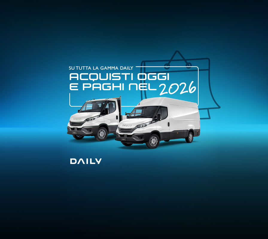 Offerta valida fino al 30/11/2025 presso le concessionarie aderenti e così strutturata: Leasing a 60 mesi a tasso 4,59% DAILY su valori di fornitura fino a 45.000€ e soggetta a condizioni. Esempio di fornitura 45.000€: anticipo versato dal cliente 10%, valore finale di riscatto 10%, 1° rata a 90 giorni, 58 canoni mensili da 794€ comprensivi di Polizza Furto e Incendio Plus, Tasso Leasing 4,59% . Spese pratica, IVA, trasporto e messa su strada escluse. Salvo approvazione IVECO CAPITAL (CNH Industrial Capital Europe S.A.S.). L’offerta prevede l’estensione di garanzia per il terzo anno al costo complessivo di 99€ oltre iva (contratto “XXL”, durata 36 mesi, garanzia valevole per veicoli con percorrenza annua massima di 30.000 km oppure un massimo di 90.000km totali) applicabile solo con attivazione di un leasing a marchio IVECO CAPITAL. Prima di aderire al finanziamento è necessario prendere visione delle Condizioni Contrattuali e dei Fogli informativi disponibili presso le concessionarie aderenti. Possibilità di personalizzare l’offerta con altri importi e durate direttamente in concessionaria. Per i dettagli sui contenuti e sulle condizioni del contratto “XXL” fare riferimento al contratto di estensione di garanzia reperibile presso tutte le concessionarie aderenti. La Polizza Furto e Incendio Plus è un prodotto CAPINSUR della Compagnia Assicurativa Società Reale Mutua di Assicurazioni. Prima della sottoscrizione leggere i SET INFORMATIVI disponibili sul sito: https://www.ivecocapital.com/italy Le coperture assicurative sono prestate da Società Reale Mutua di Assicurazioni per il tramite di CNH Industrial Capital Europe S.A.S., intermediario assicurativo iscritto al R.U.I., sezione UE al n. UE00008195 - PEC: cnh_ce@legalmail.it avvalendosi della collaborazione della rete commerciale iscritta nella specifica sezione del R.U.I e soggetta alla vigilanza dell'IVASS. Gli estremi identificativi e di iscrizione possono essere verificati sul sito internet dell'IVASS (www.ivass.it). Immagine a puro scopo illustrativo. Messaggio pubblicitario con finalità promozionale.